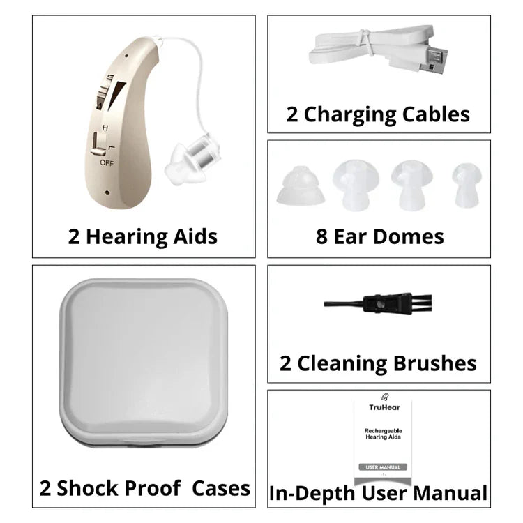 TruHear™ Rechargeable Hearing Aids provide a discreet behind-the-ear design with crystal-clear audio and no screeching or whistling. These invisible hearing aids enhance voices, reduce background noise, and offer up to 48 hours of battery life on a single charge. Lightweight, comfortable, and rechargeable, TruHear™ is the affordable solution for clearer, everyday hearing.